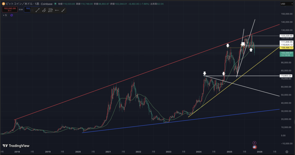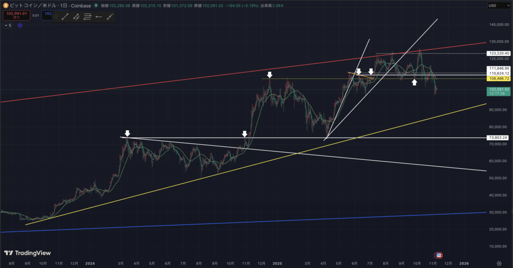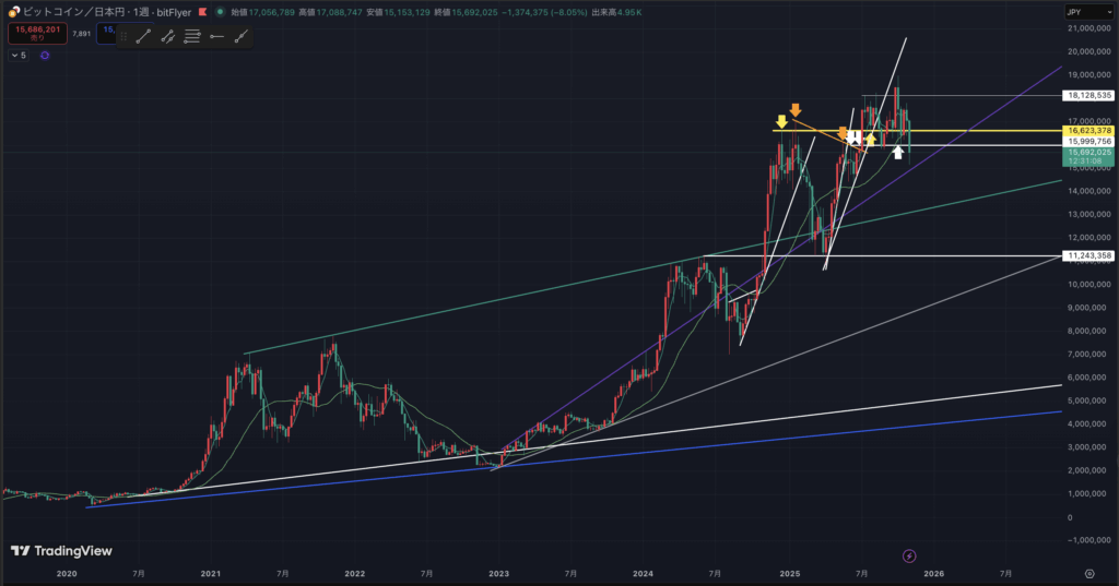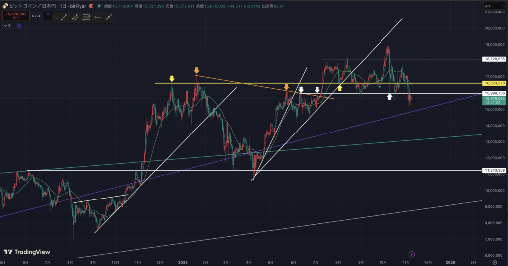 紫と緑のラインが下にはありますが、2021年の高値を起点とした、緑のラインの方が効いているように見えます。
