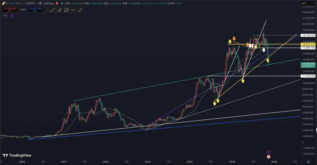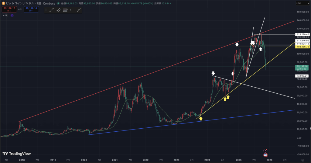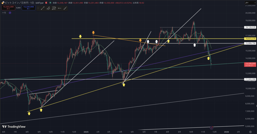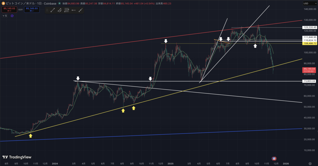 昨年の8月を起点としたサポートライン(黄色)を下抜けてしまいました。