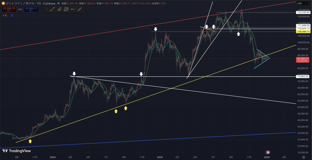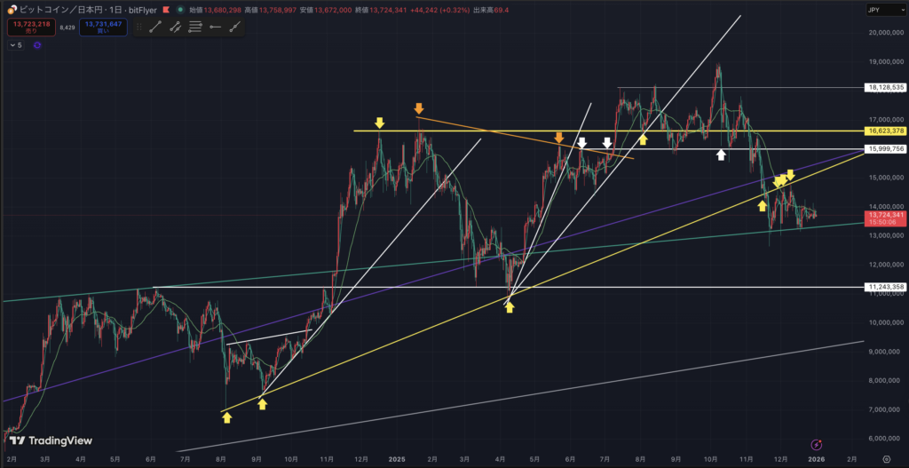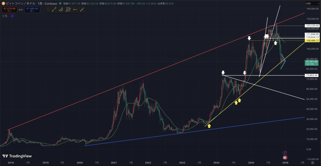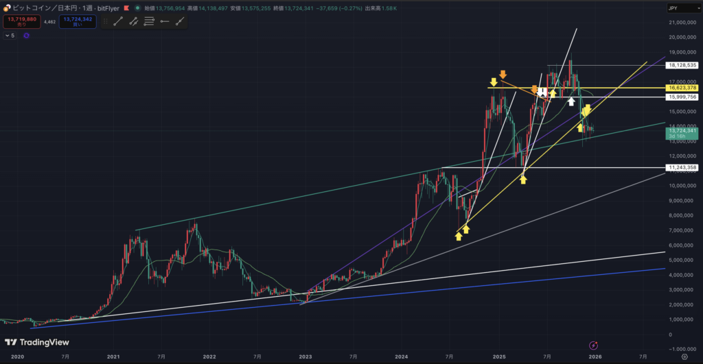 BTC円建ての週足チャートです。