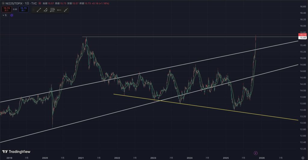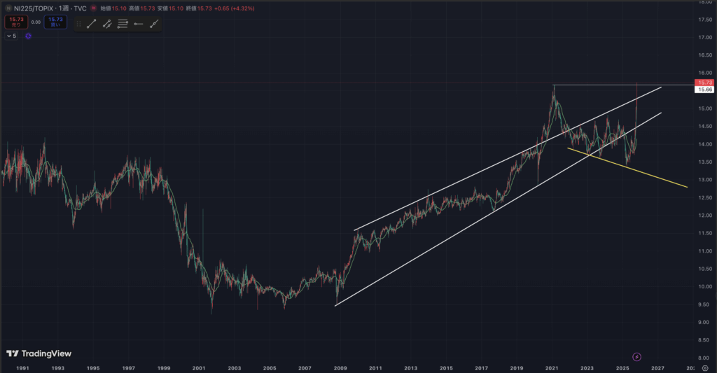 日経平均をTOPIXで割ったNT倍率を見ていきます。