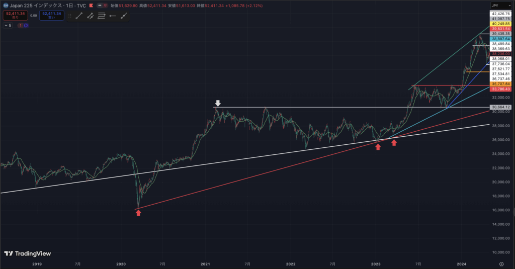 白い矢印が2021年の2月で、前回の高値だったところ。