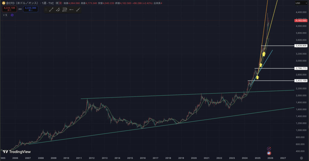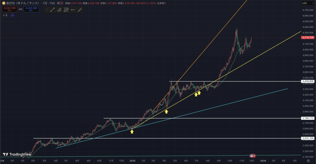 このまま上に行くかもしれませんが、どこかのタイミングで一度黄色のラインにタッチしに来るのではないでしょうか。