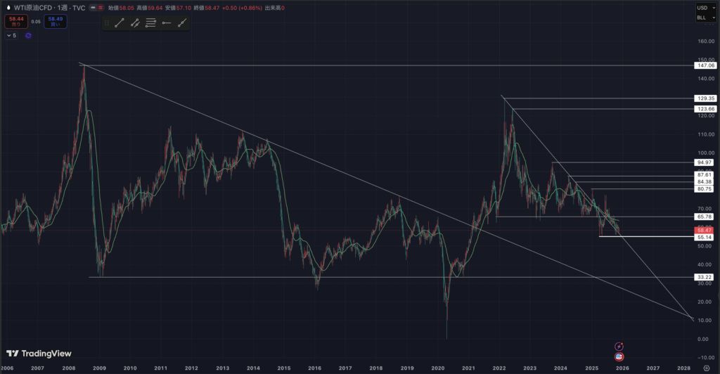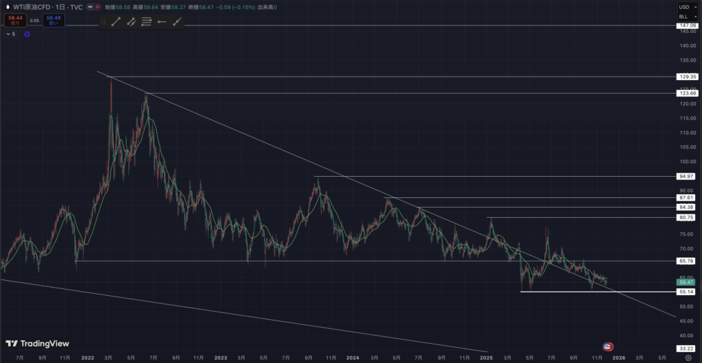 今年4月の安値からの55ドル台のところに水平ラインを引いていますが、原油は今のところここがサポートラインになっているよう。