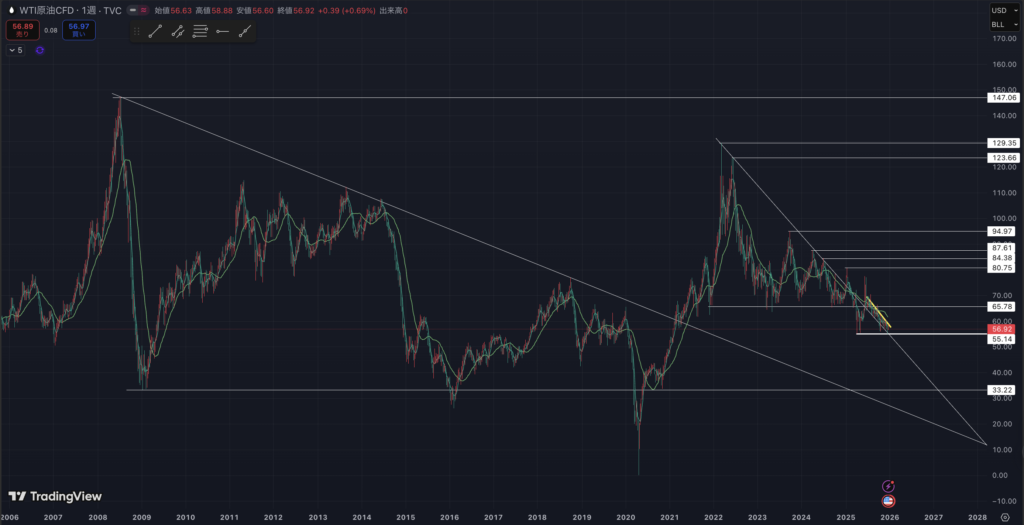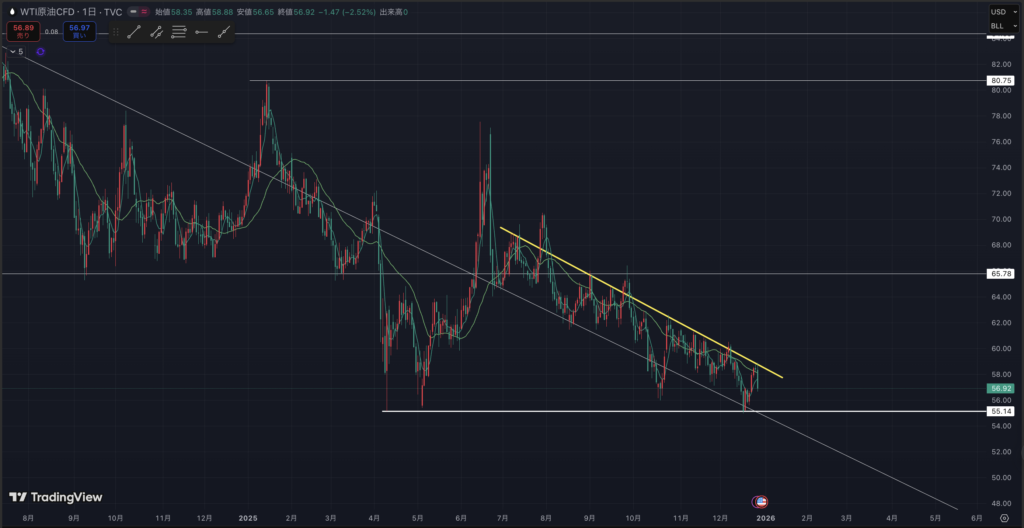 このラインに上値を押さえられている状態が続いていて、下値サポートも近づいてきたのでそろそろ動くのかも。