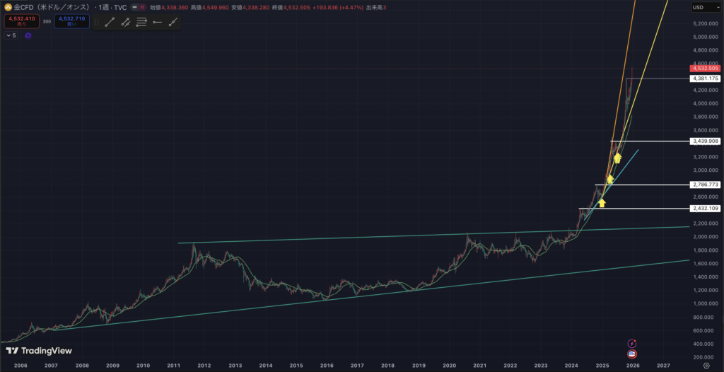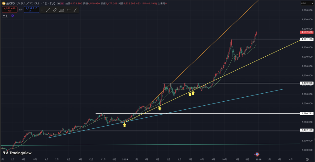 こんな金の上昇に立ち会えるなんてそうそうないことだと思うので、よく見ておきたいところ。