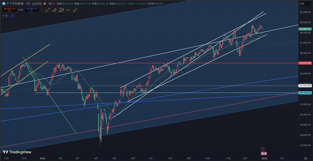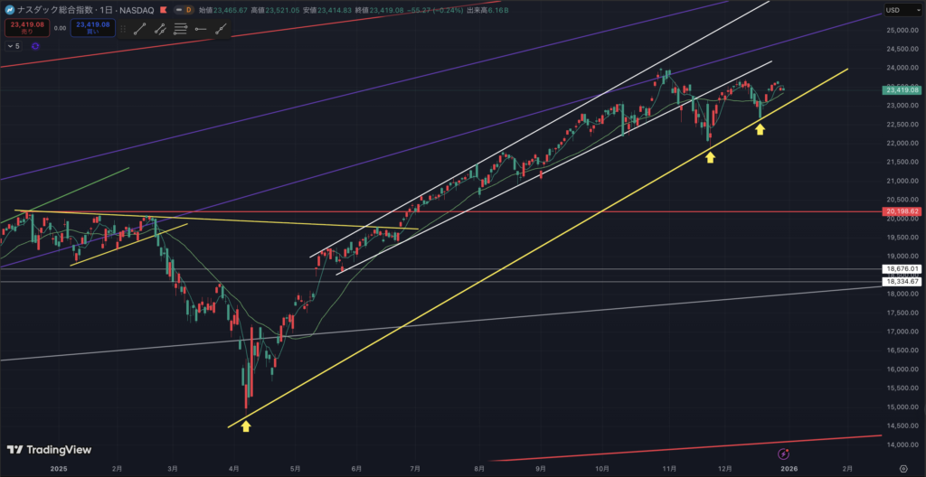 ナスダックも上影陰線で、上ひげが5日線に押さえられた形です。