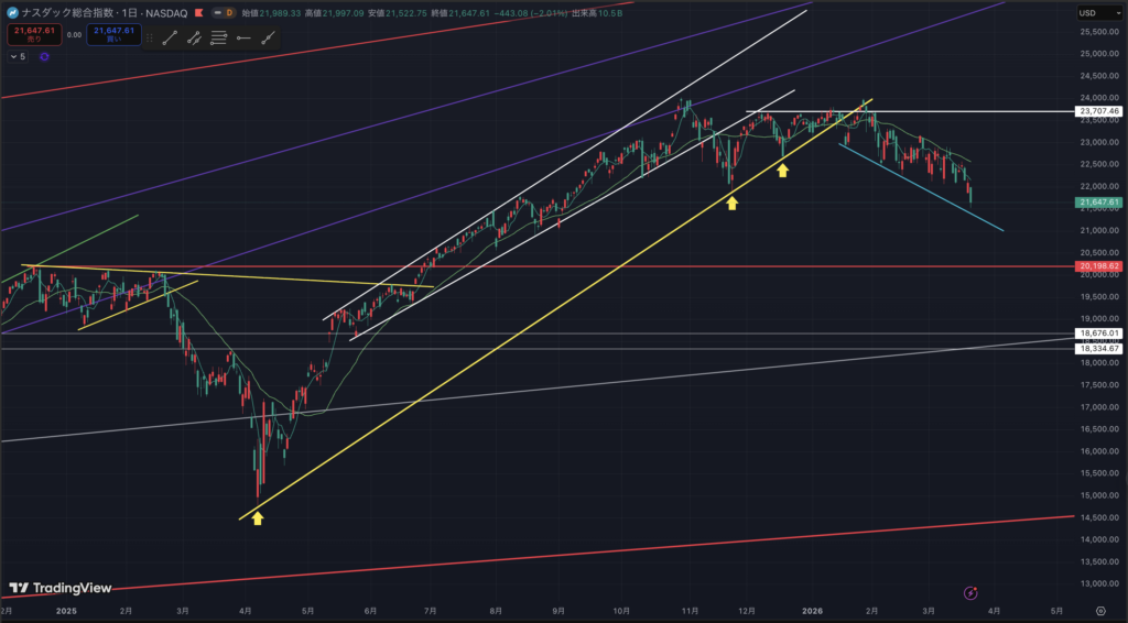 ナスダックは下落のサポートラインまでもう少し。