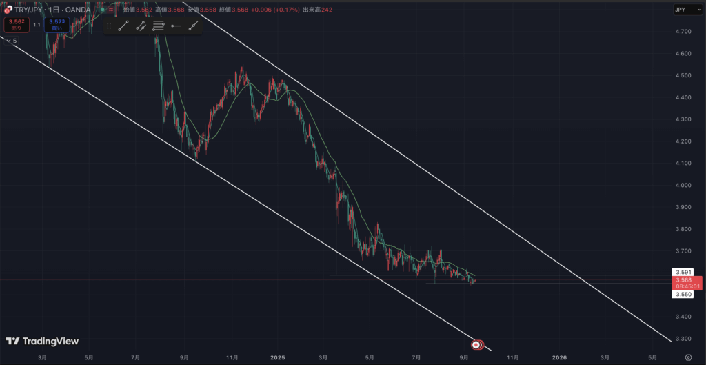 ウェッジの下限にタッチすれば、トルコリラも短期の買いで入っても良さそうですが、ラインからはどんどん遠くなるわ、安値は更新するわで、一向に買い場になりません。