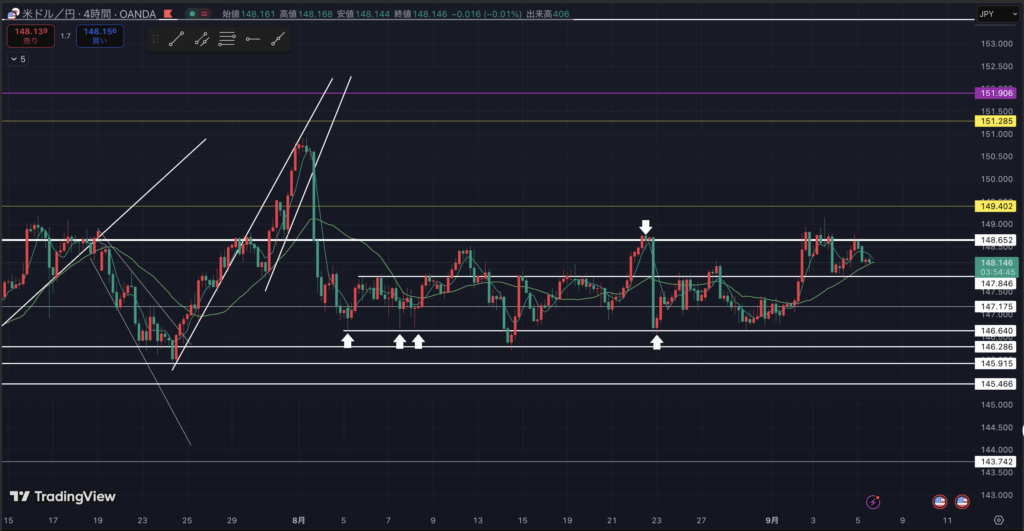 なぜかここの148.652円付近が堅いようです。