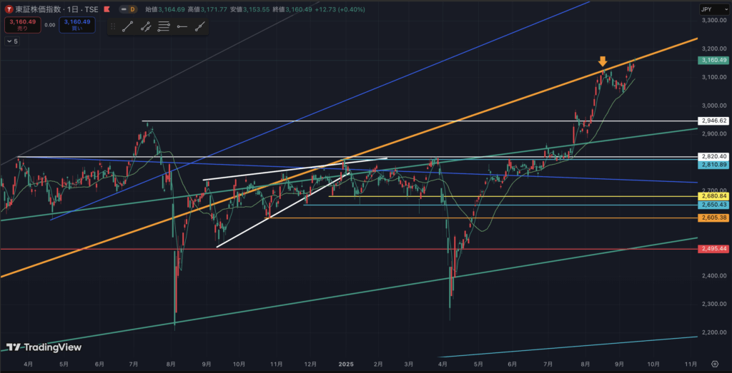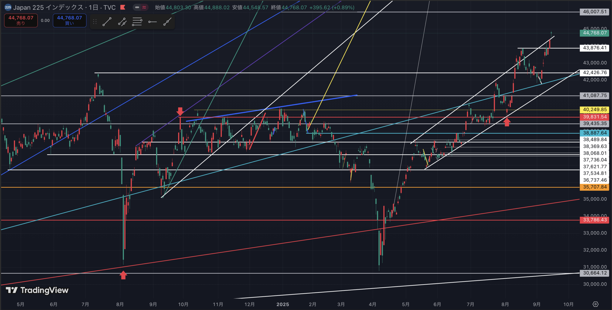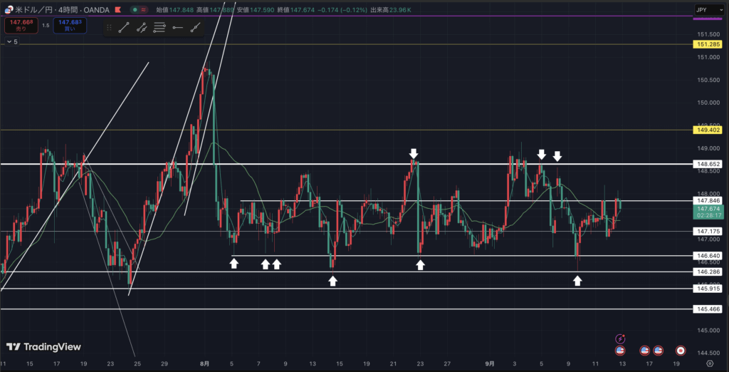 まあこちらの時間軸は1週間程度なので、大局を見るなら日足ですね。