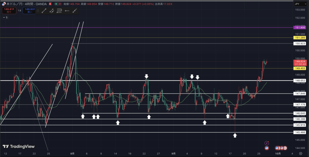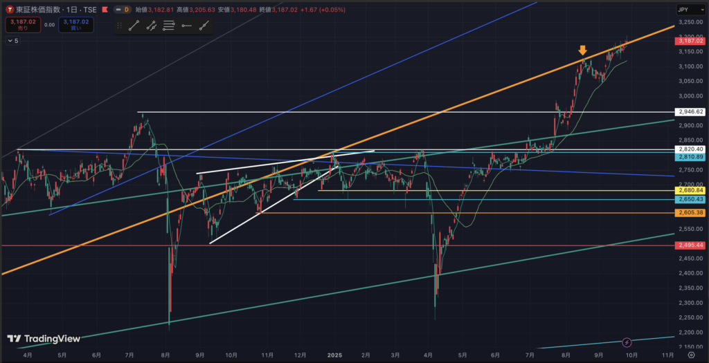 5日線を割って下落の予感ですが、すぐ近くのラインで週明けどういう反応をするかに注目です。