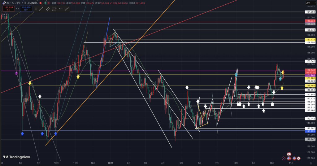 ドル円も大きく動いていますがまだ方向感はない感じ。