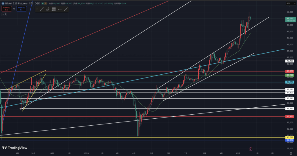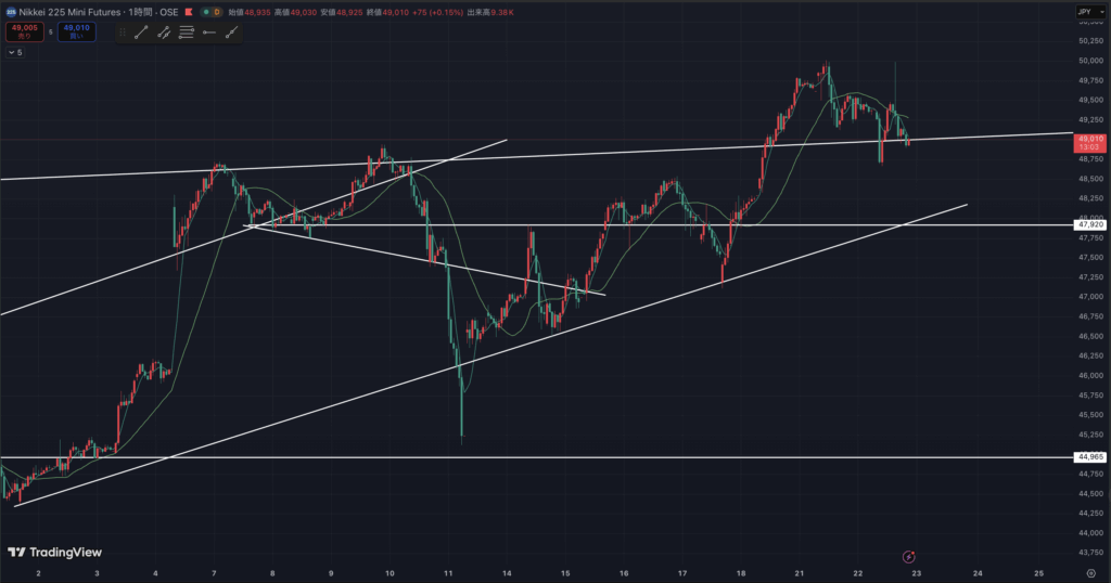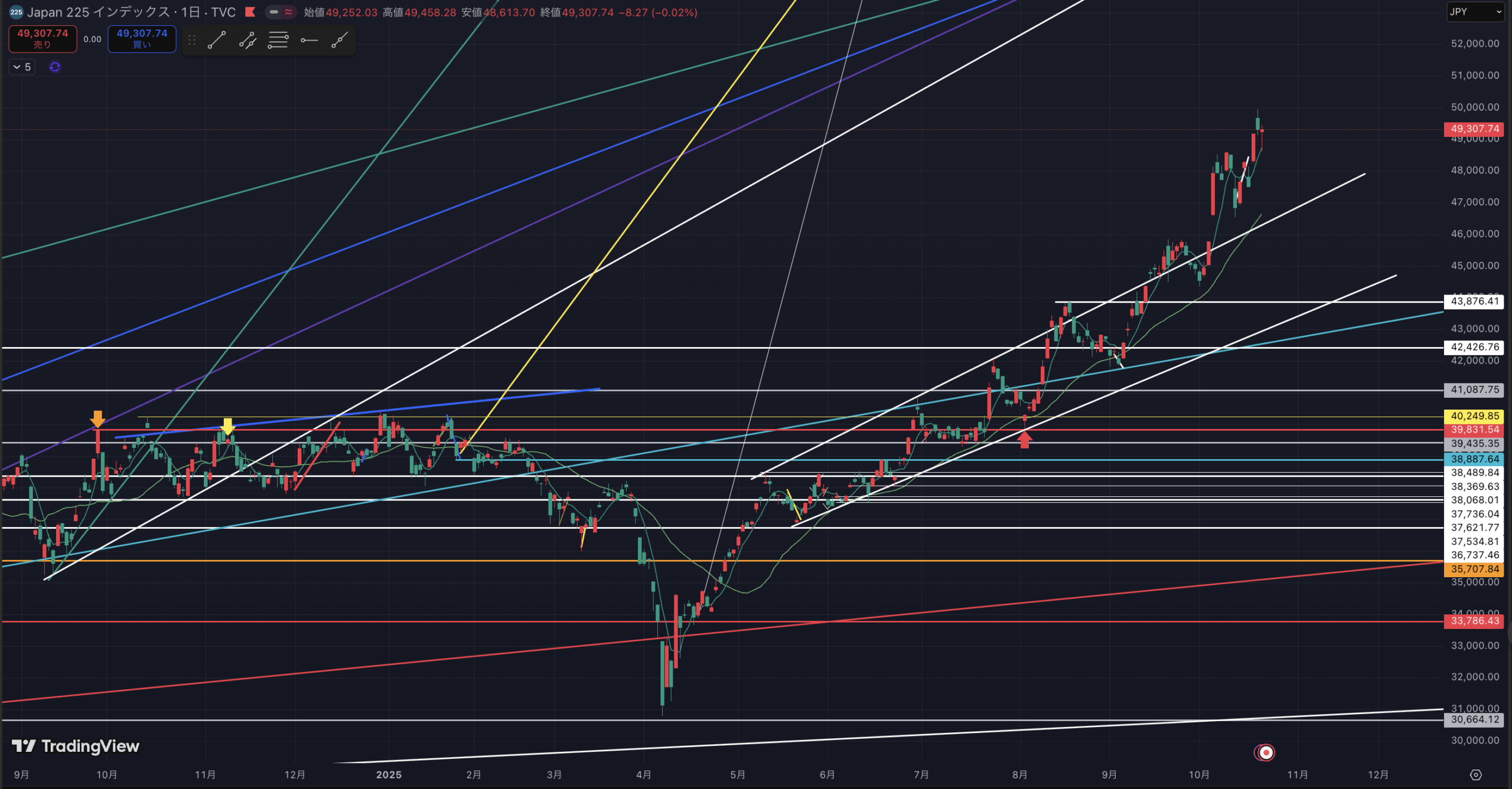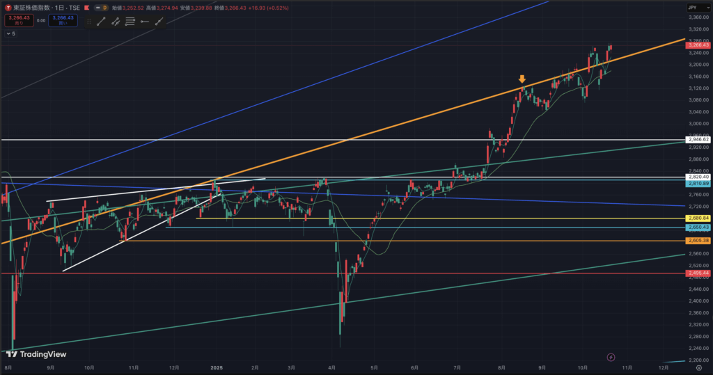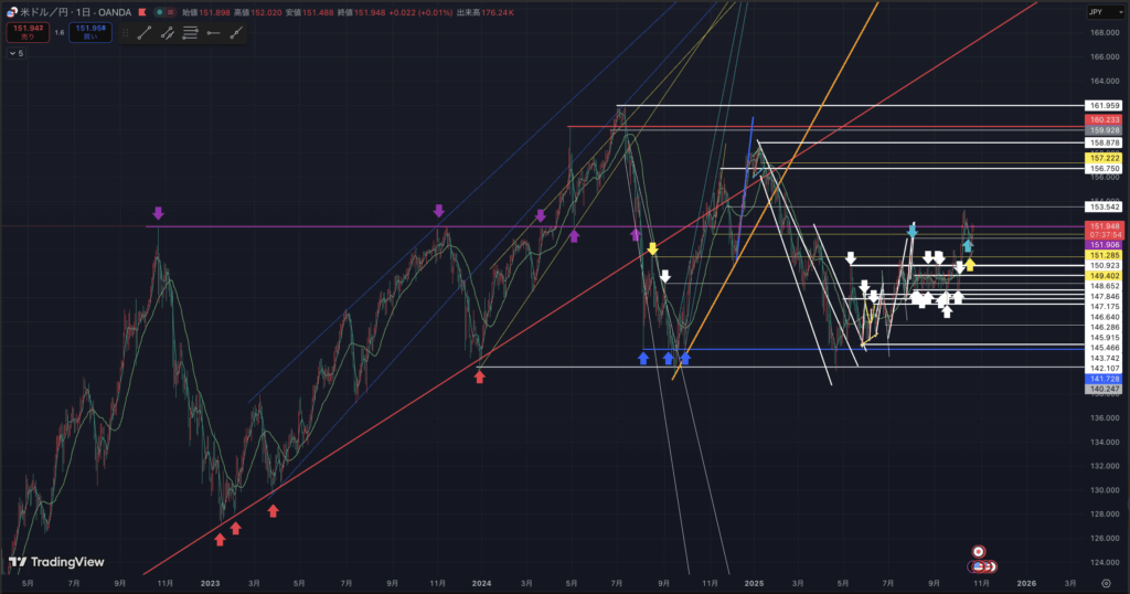 3年前の2022年10月21日の高値のラインですが、ここからドル円はわずか3ヶ月で127円台まで下がるので、ここはバチバチに意識されるラインです。