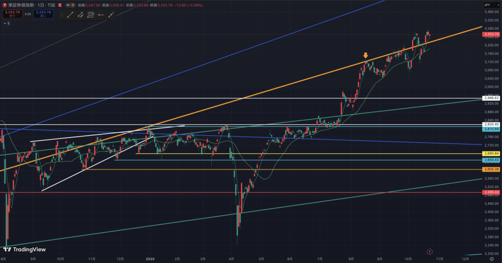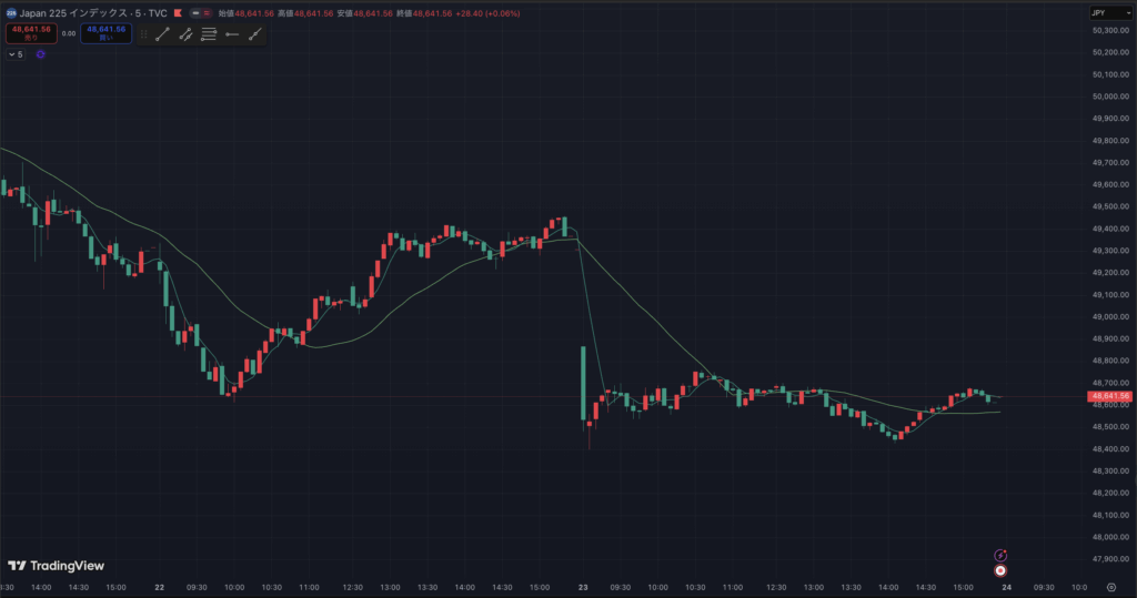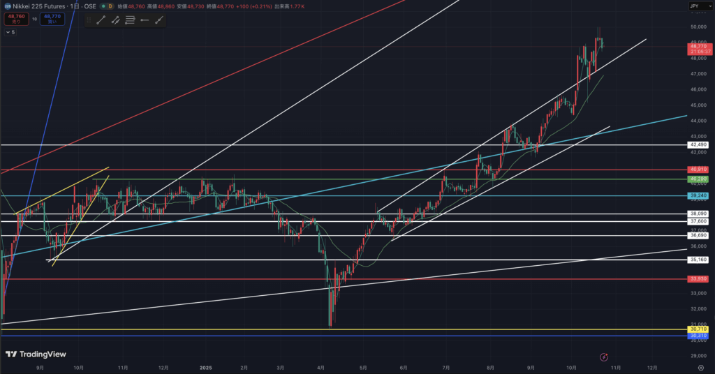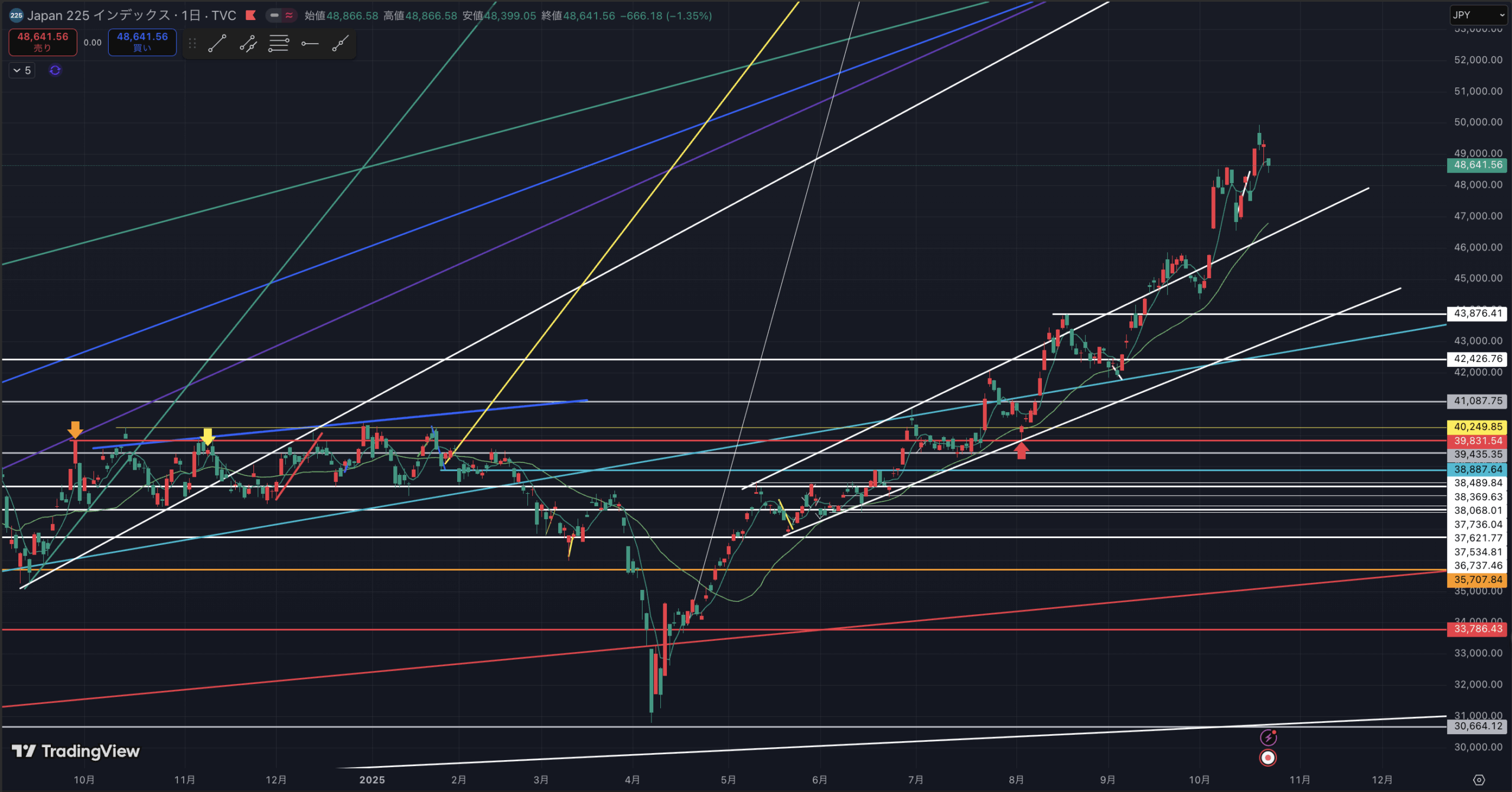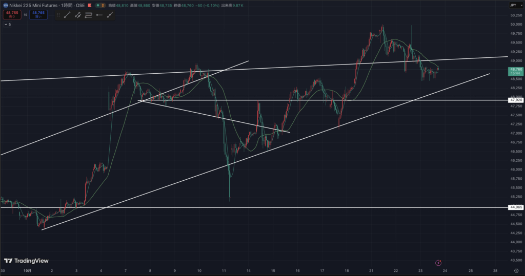 下げた場合、反発のポイントは斜めのラインだけど、そこまで下げると48200〜48300円台。