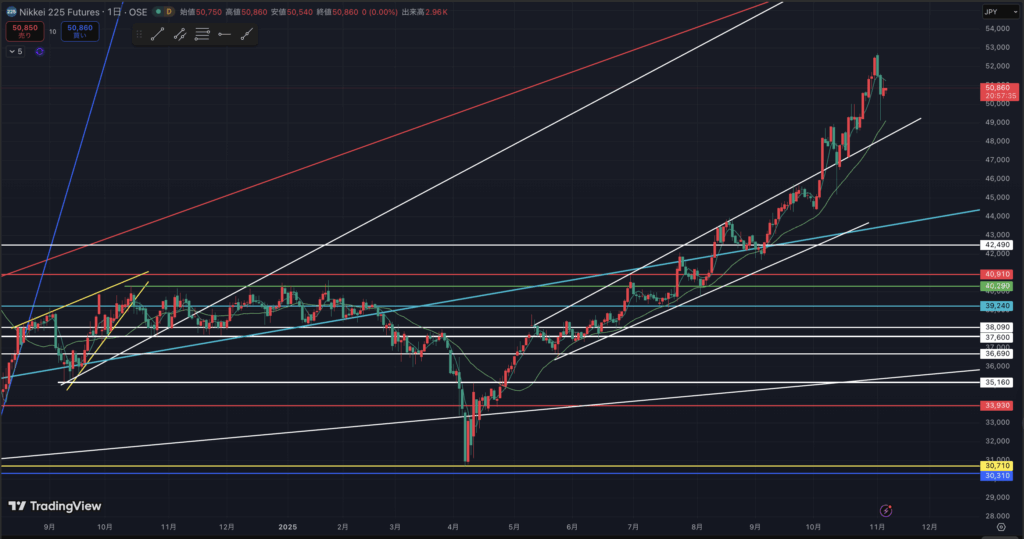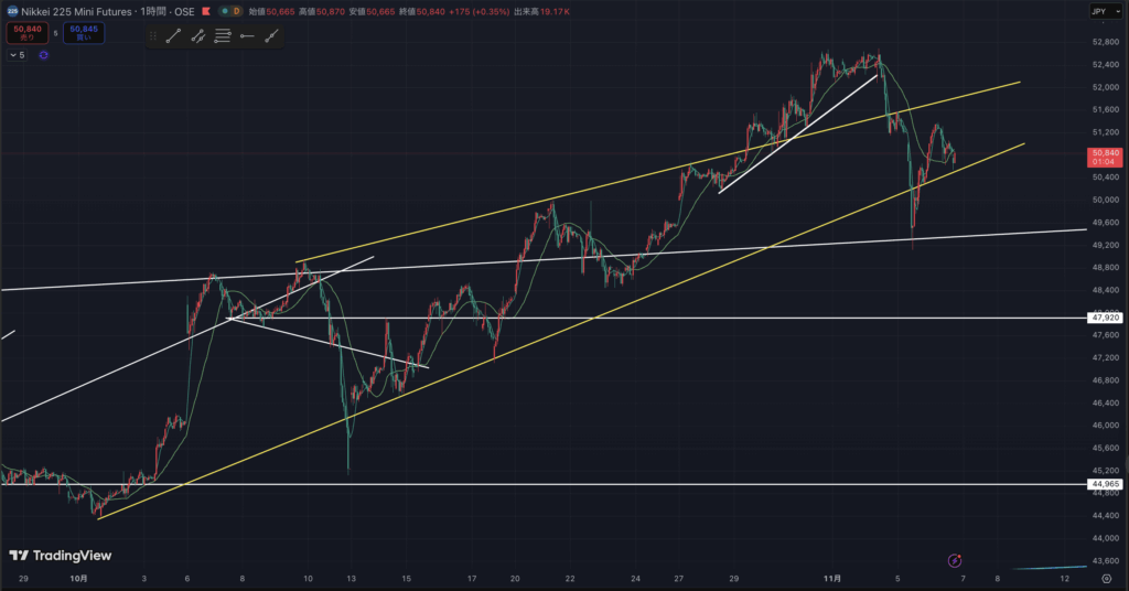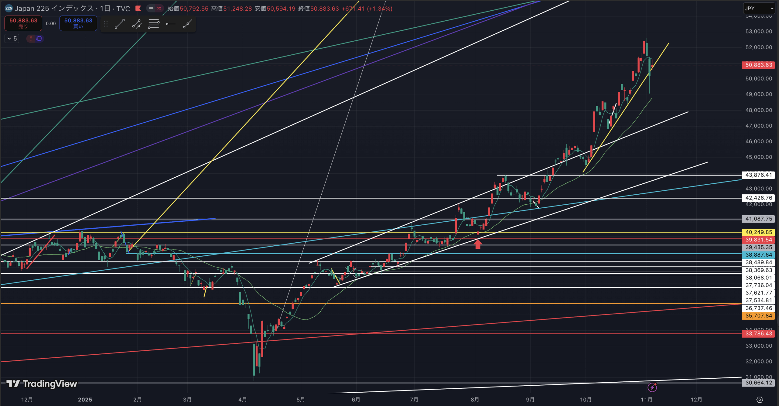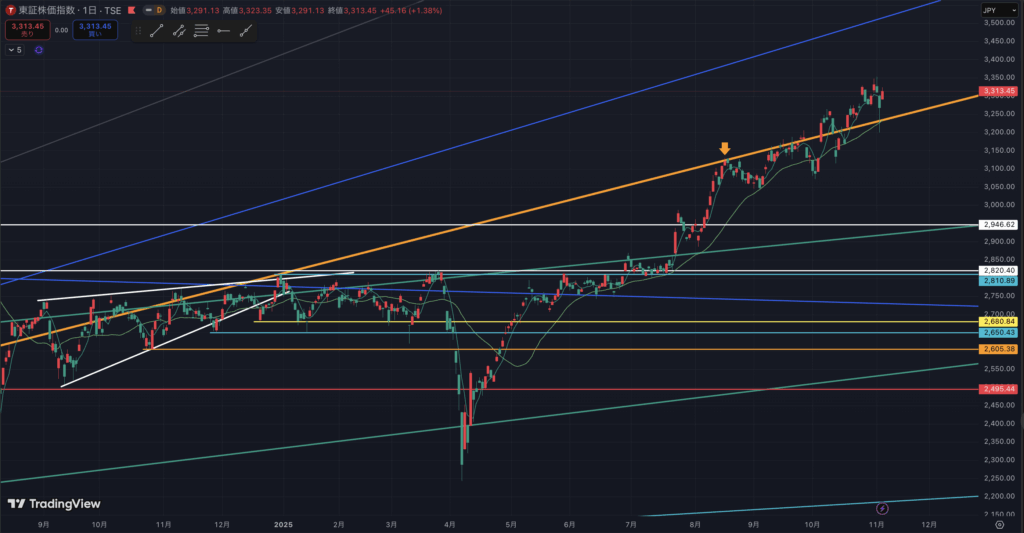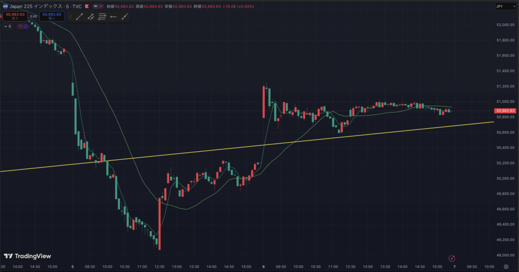 ローソク足の実体が、黄色のサポートラインより上に来ていますが、上ひげが5日線に抑えられています。