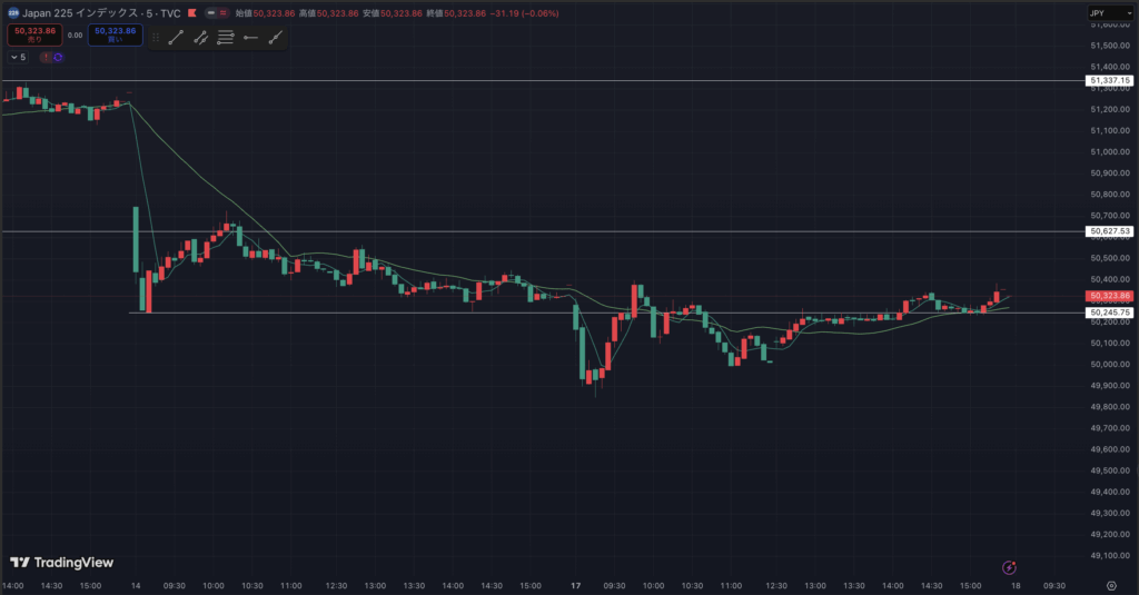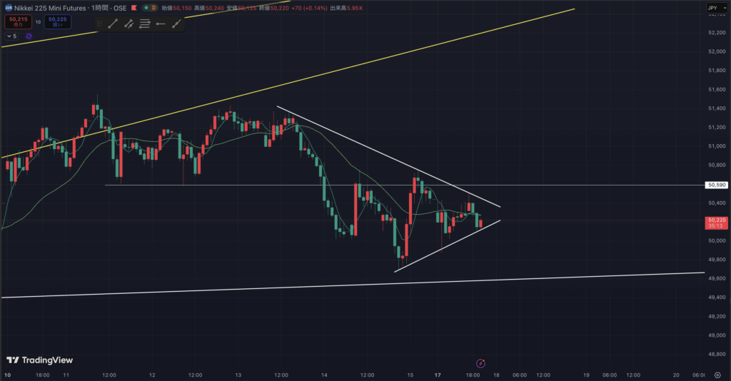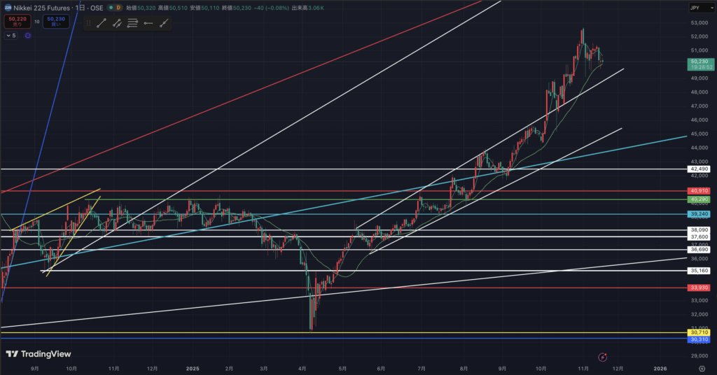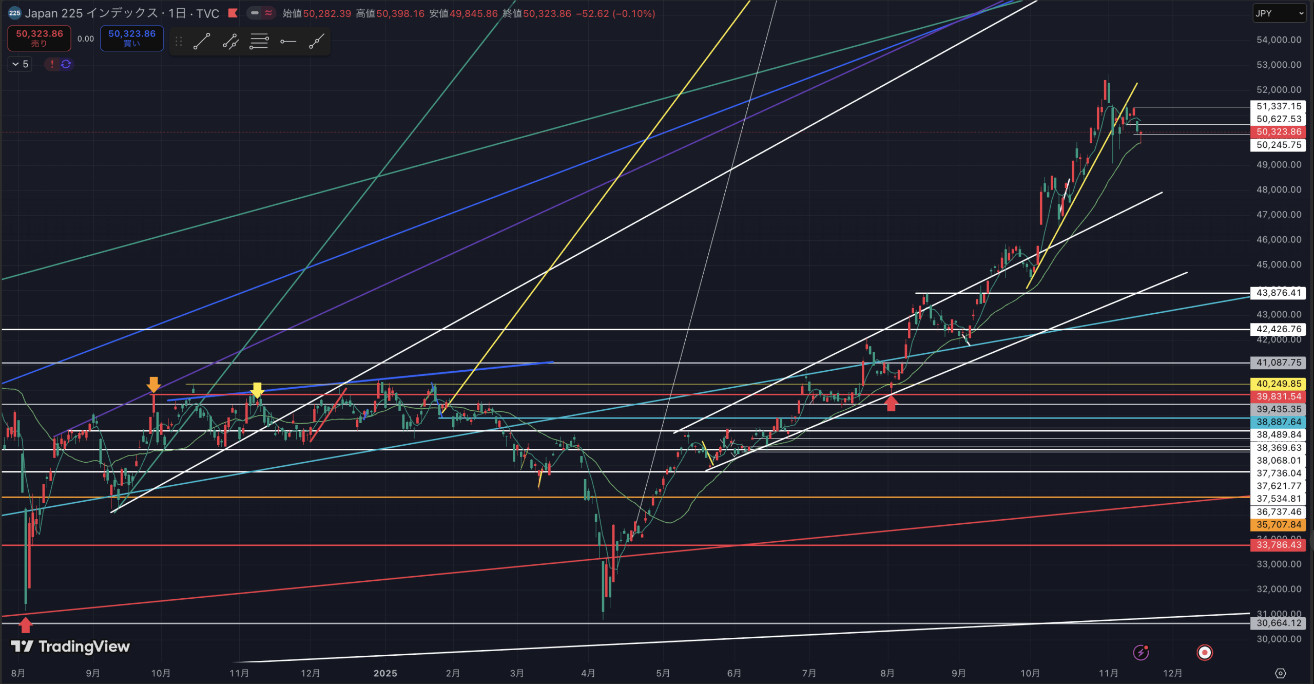 割れて今夜中に下の白いラインまで下げると49000円付近。