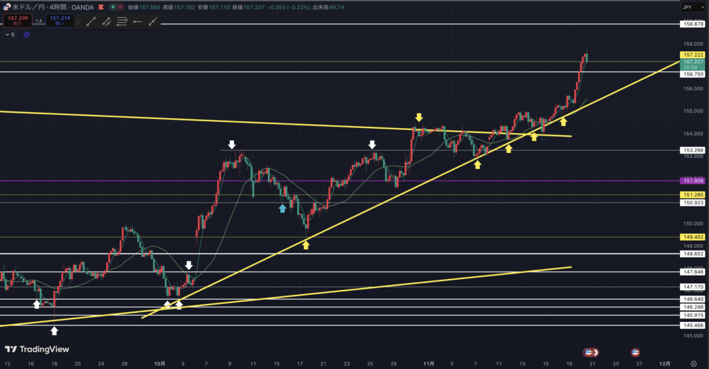 10月からの動きを見ると、サポートラインから離れては戻っての繰り返しなので、またタッチしに戻る可能性が高そうです。
