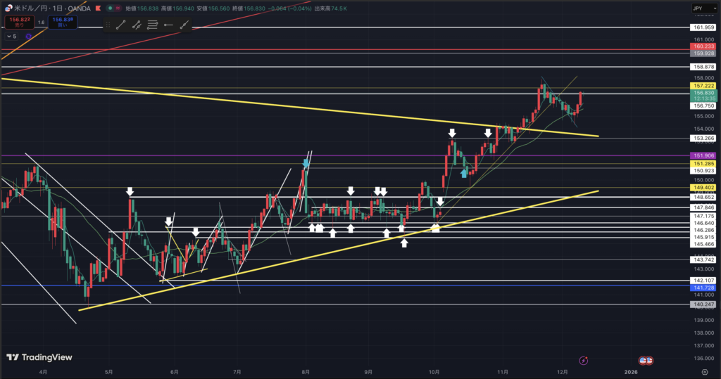 とりあえず上値目処は、先月20日につけた157.9円付近。
