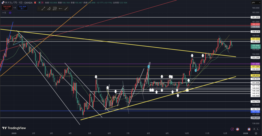 ドル円も下落しましたが、まだ25日線に沿っているので一応上昇トレンド継続ではないでしょうか。