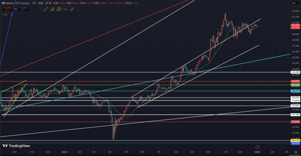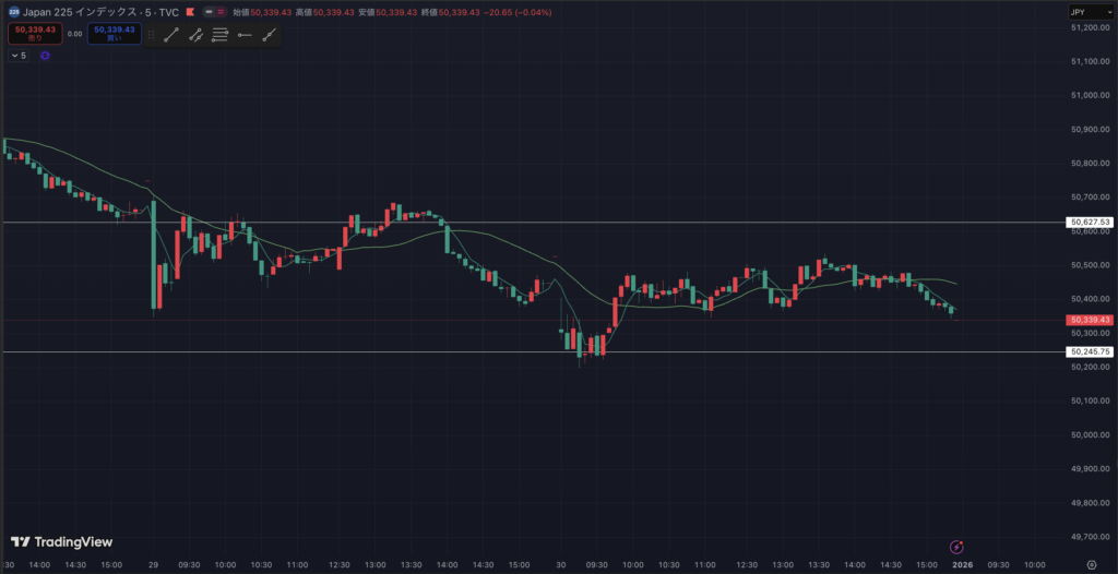 寄り付きから300円ほど下げ、ゆるく戻し、ゆるく下げたのは昨日と同じ動き。