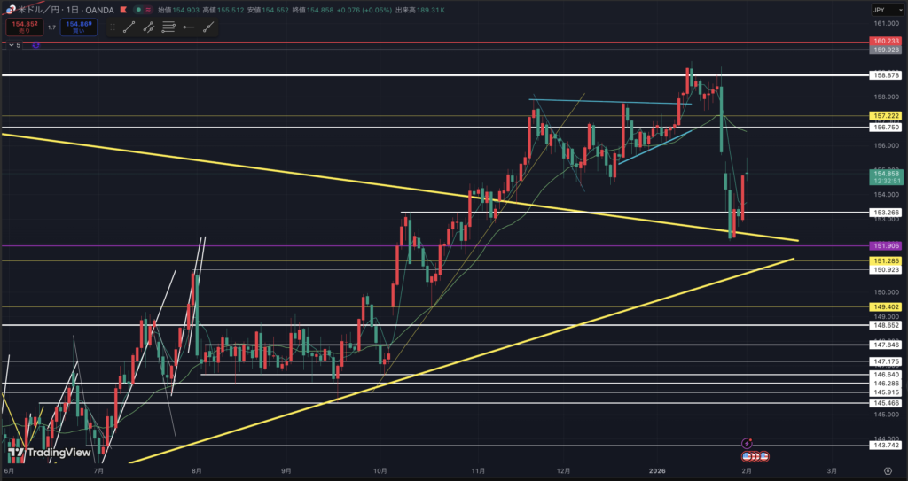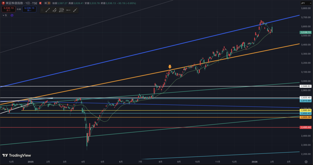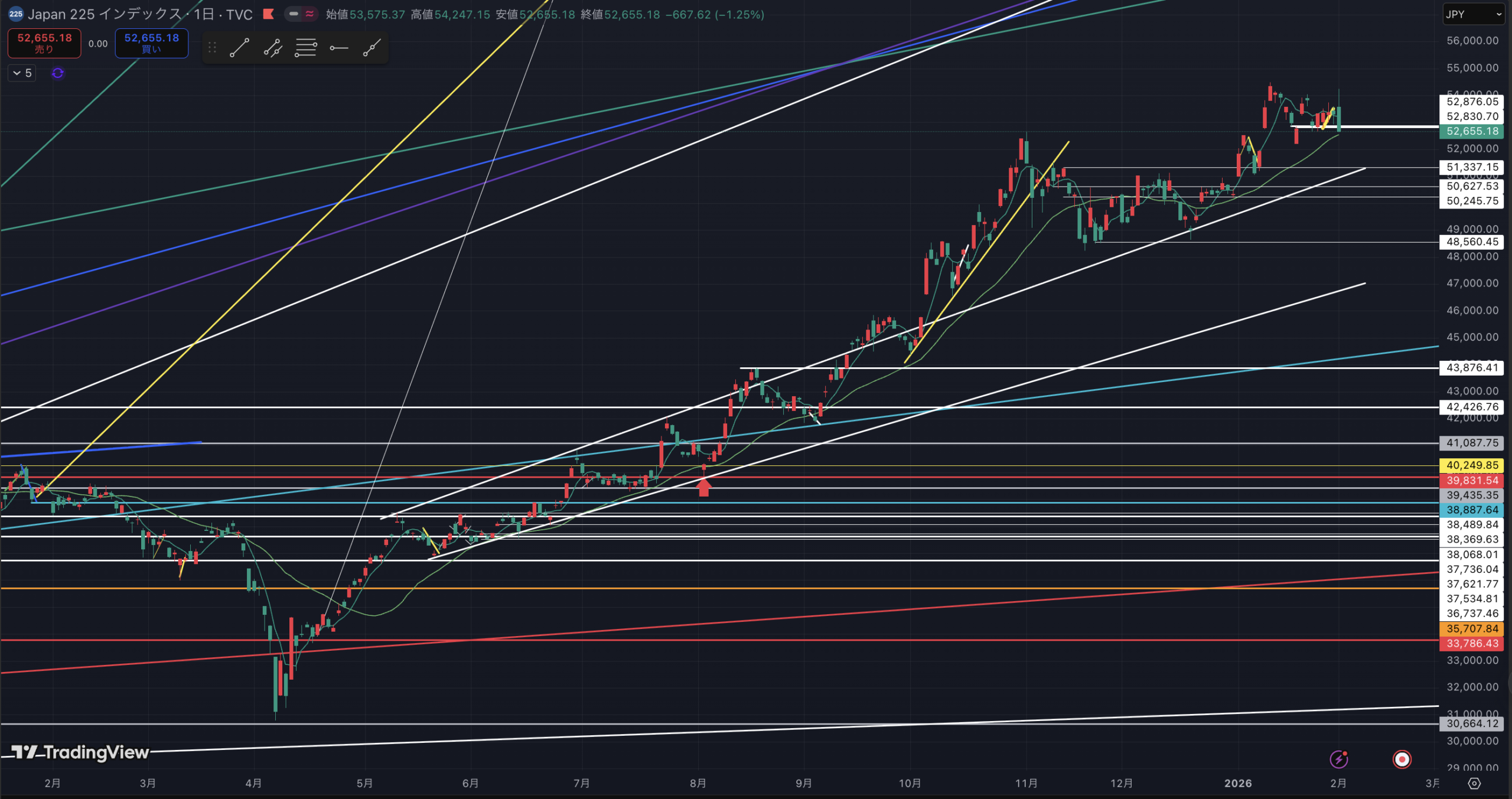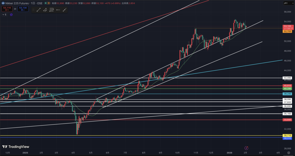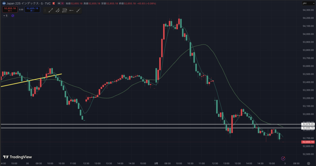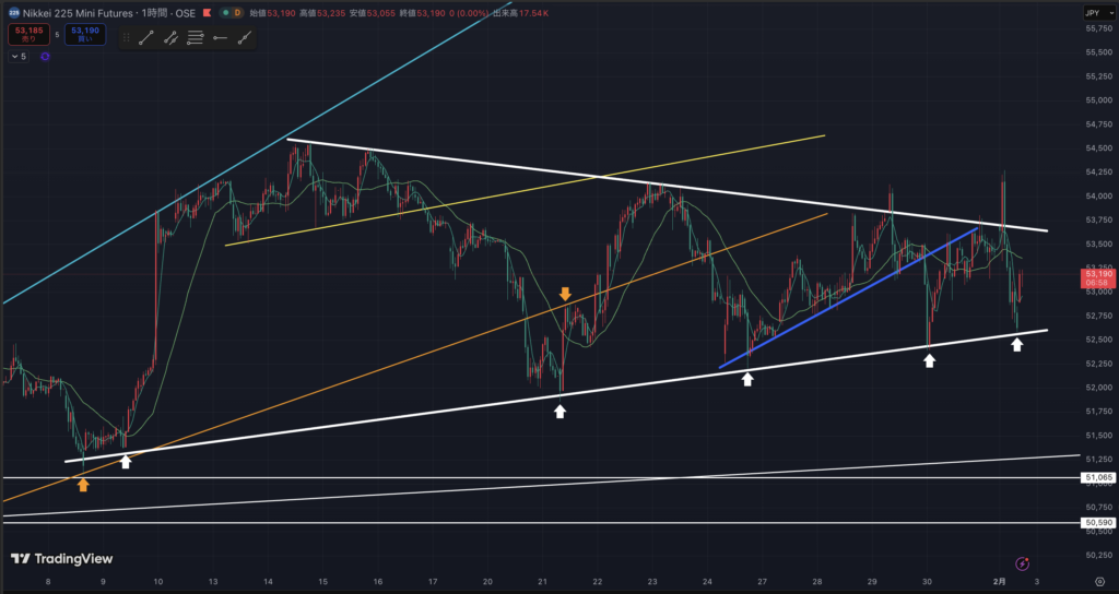 先物は長めの上ひげができていますが、ラインで何とか踏みとどまっている状態。