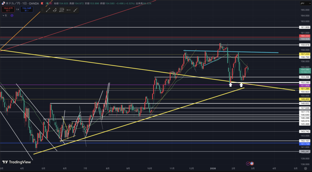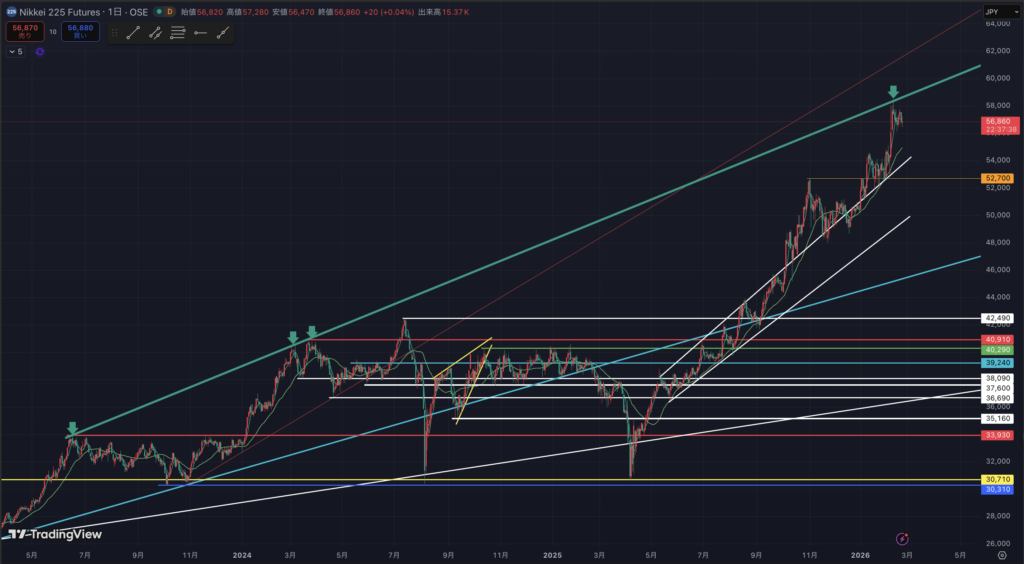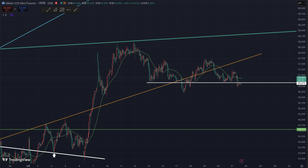 56670円付近、何度か下げ止まっていて、少し意識されていそうな水平ラインがあります。