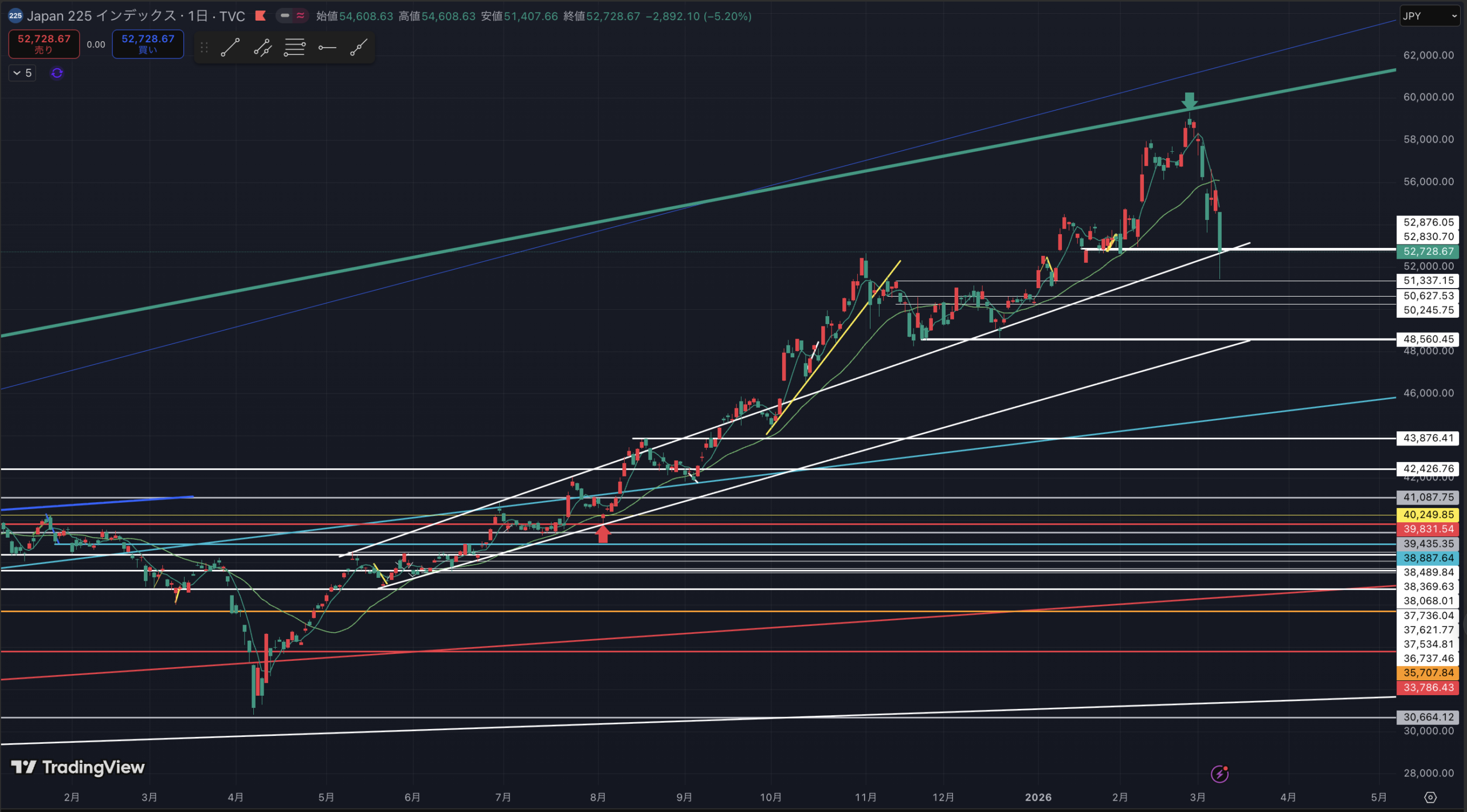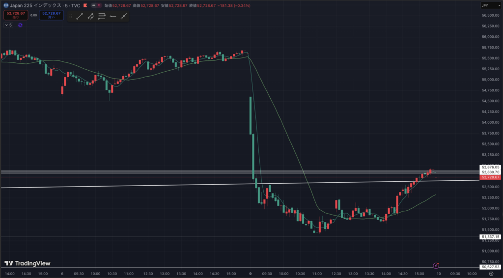 今日の下落で53635円のサポートラインをあっさり下抜け。