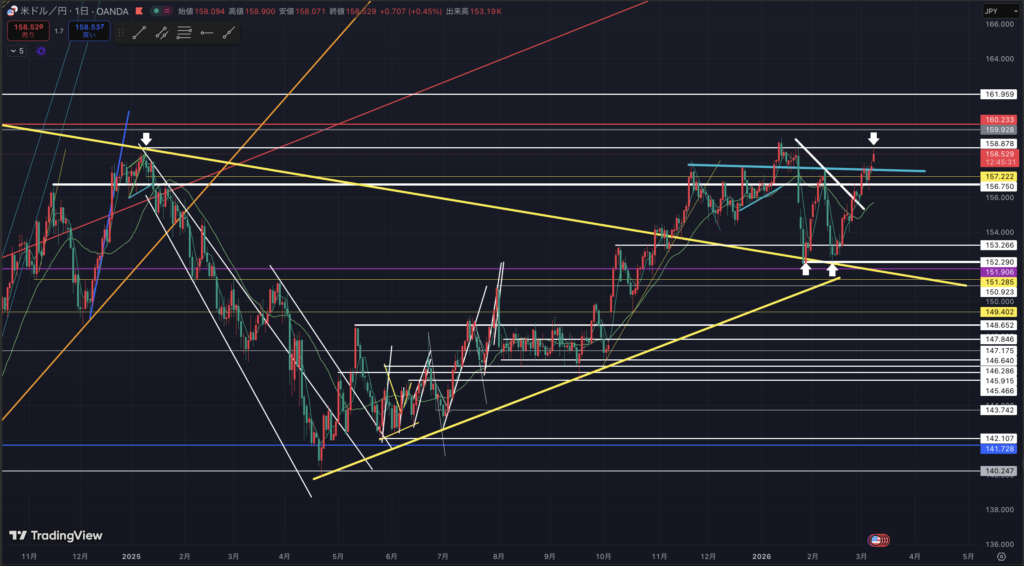 この辺ではオレンジのラインが意識されると思いますが、下抜けたら次は白のサポートラインが目処です。
