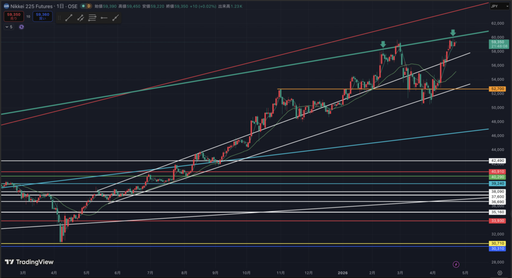 2月の高値は超えているのに、6万円を意識してか手前で足踏み。